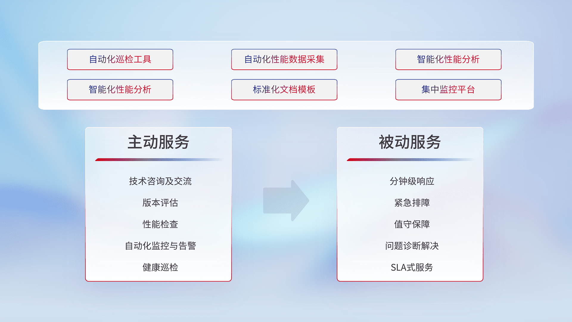 智能化工具和标准化文档,,,,保障服务质量,,提供主动服务(包含技术咨询、、、、版本评估、、、性能检查、、、自动化监控与告警、、、、健康巡检)和被动服务包含(分钟级响应、、紧急排障、、值守保障、、、、问题诊断解决、、、、SLA服务)。。